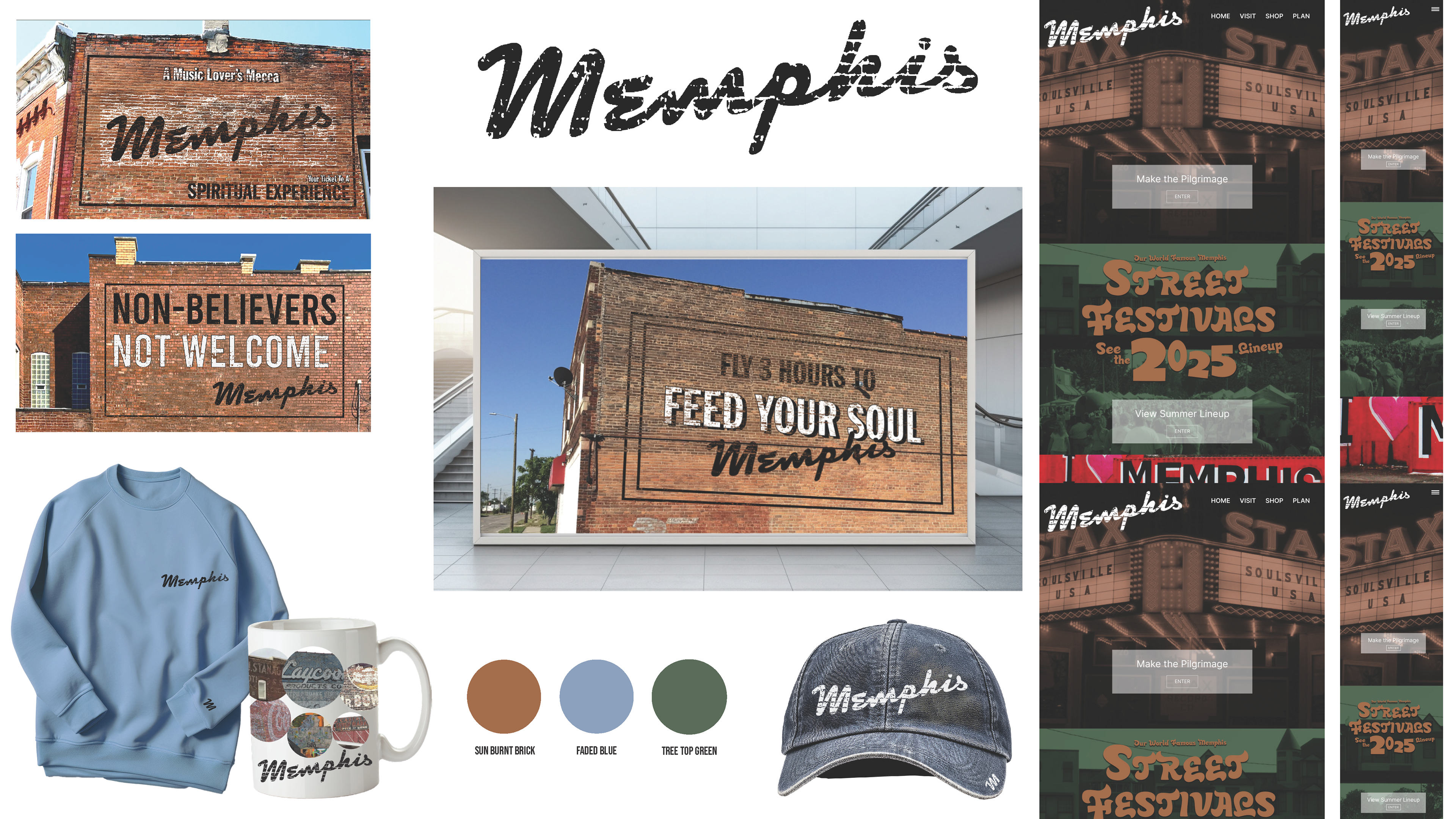 A collection of merch and a rebranded website using distressed typography and developing a color palette to be used throughout the campaign.